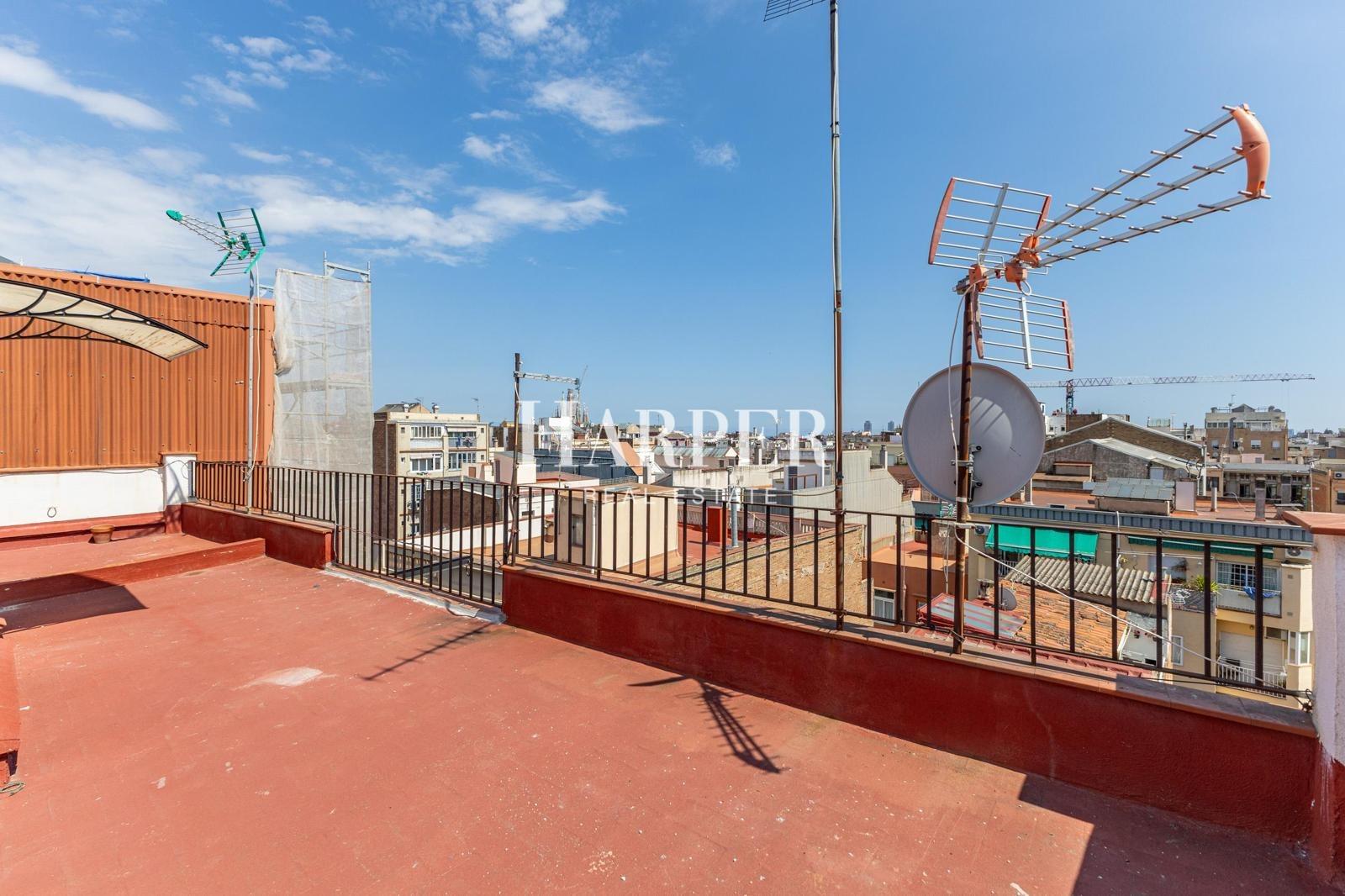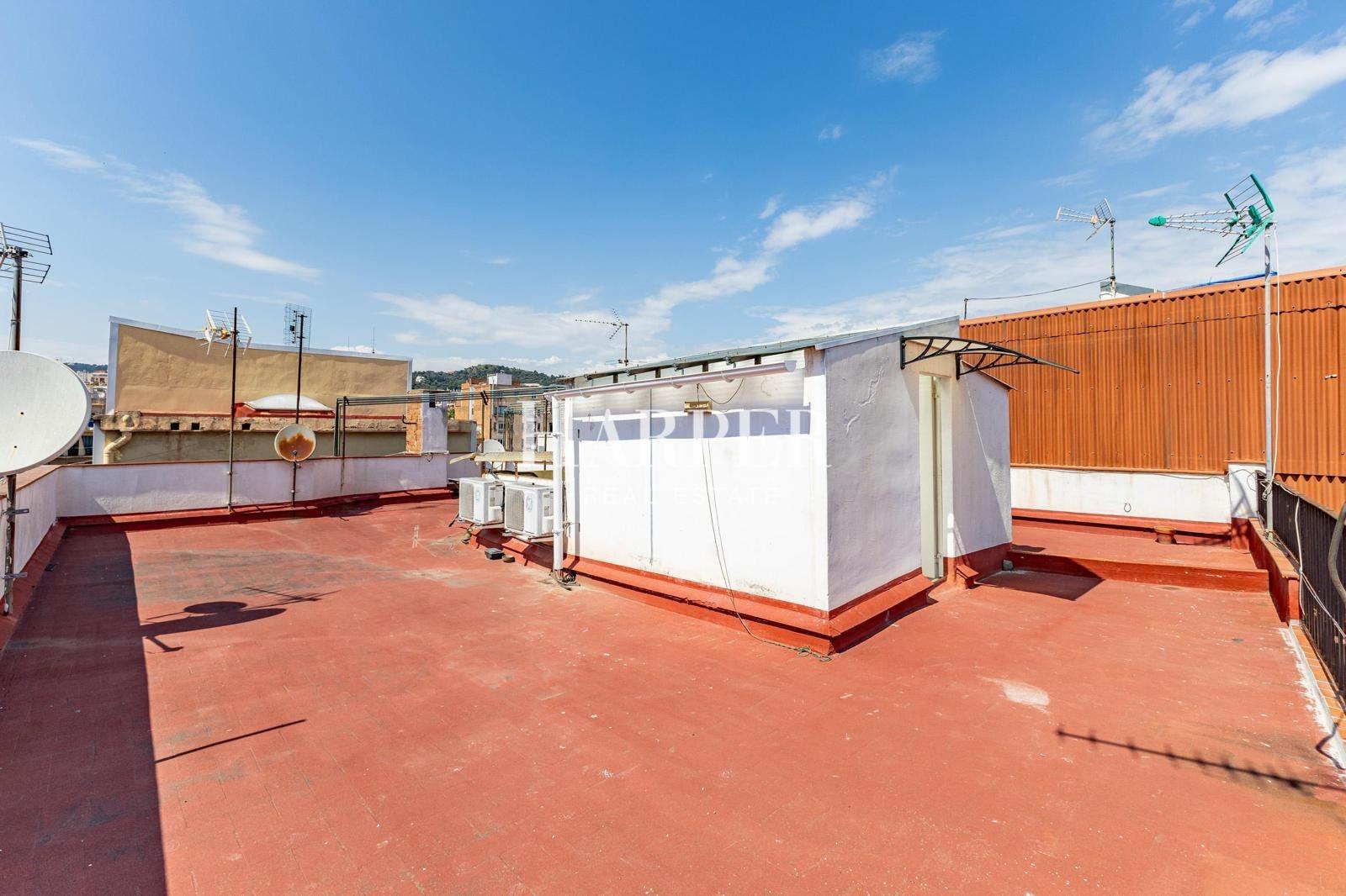 La finca no dispone de ascensor, y el acceso al piso se realiza subiendo 41 escalones. A cambio, se disfruta de un entorno tranquilo, buena ventilación cruzada y acceso a una azotea comunitaria con vistas despejadas sobre los tejados de Gràcia y hacia la montaña.