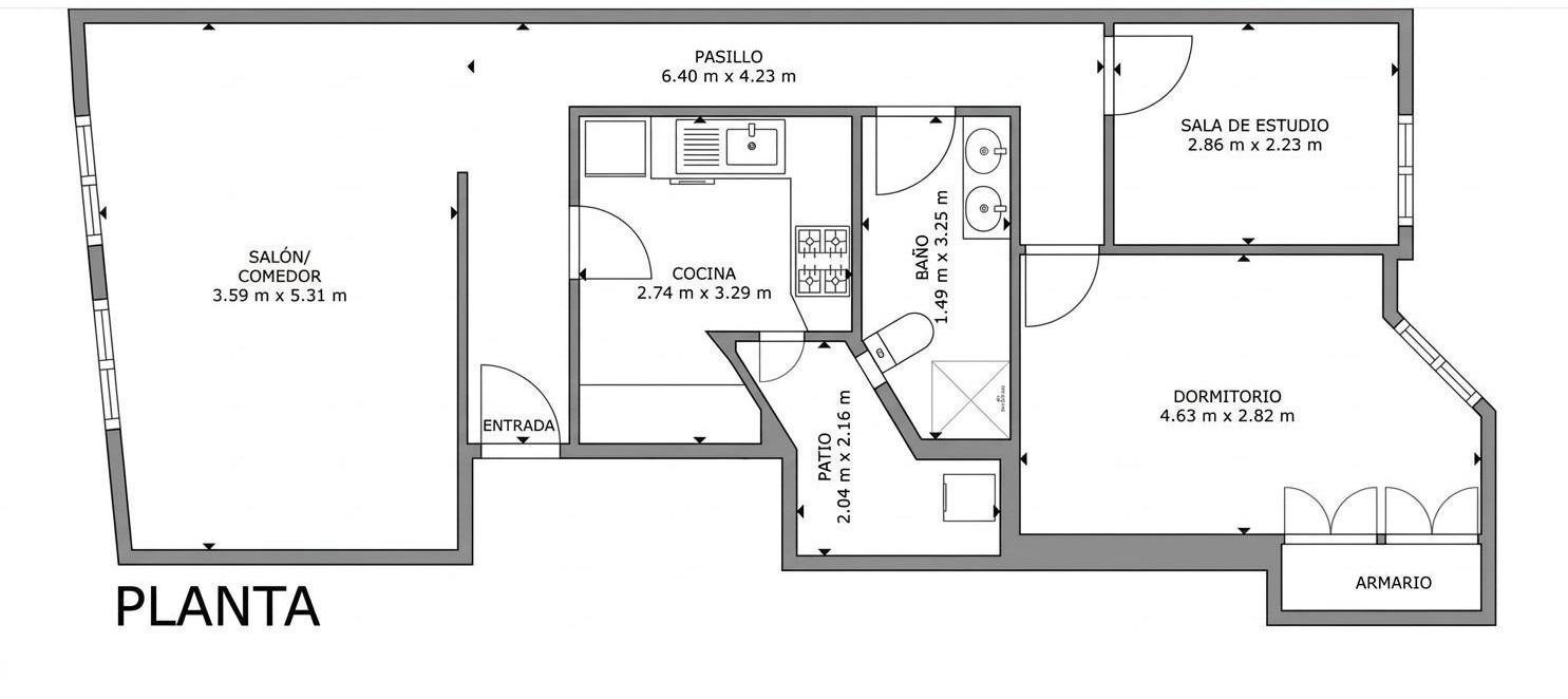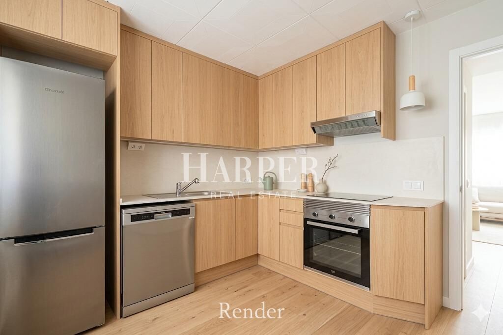 El piso cuenta con dos habitaciones (una doble y una individual), un baño completo, y un amplio salón-comedor con grandes ventanales que inundan el espacio de luz. La cocina es independiente, ofreciendo un área funcional y bien definida, separada del espacio de estar—ideal para el día a día o para recibir invitados.